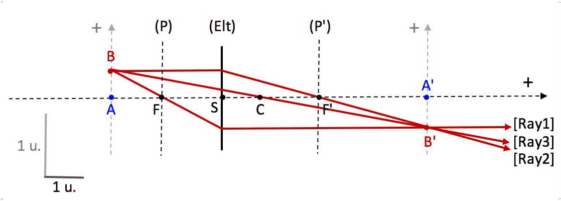 \- conjugate image point B' $\Longrightarrow$ point A' on the optical axis.