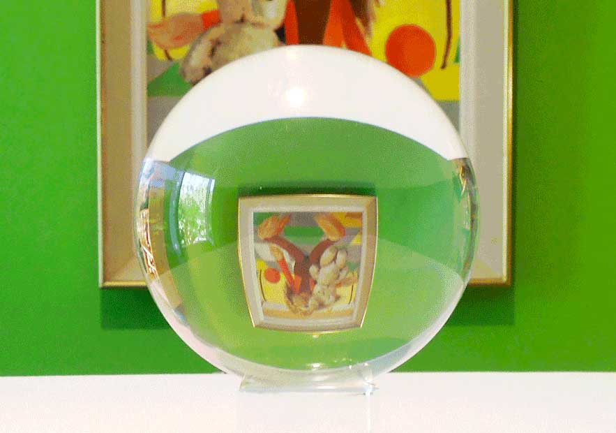 ! A ball lensball is placed in front of a painting. Depending on the position of the observer or the camera, the optical system (the sequence of simple optical elements crossed by light between the physical object and the observed image) that forms the image differs.