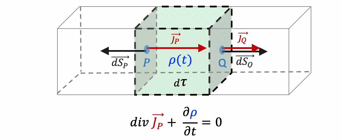 $`\displaystyle \dfrac{dQ_{\tau}}{dt}=\dfrac{d}{dt}\iiint_{\tau} \rho \cdot d\tau= \iiint_{\tau} \dfrac{\partial \rho}{\partial t} \cdot d\tau`$ * La charge $`dQ_{\tau}`$ ayant quitté (étant entrée dans) ne pouvant ni s'annihiler ni se créer spontanément au sein d'un volume, elle est égale à la charge $`dQ_S`$ ayant traversé dans le sens positif (dans le sens négatif) la surface $`S`$ délimitant $`\tau`$. Cette variation de charge $`dQ_S`$ à travers $`S`$ en un temps $`dt`$ est égale au courant $`dI`$ à travers la surface $`S`$, soit au flux du vecteur densité volumique de courant à travers $`S`$ :