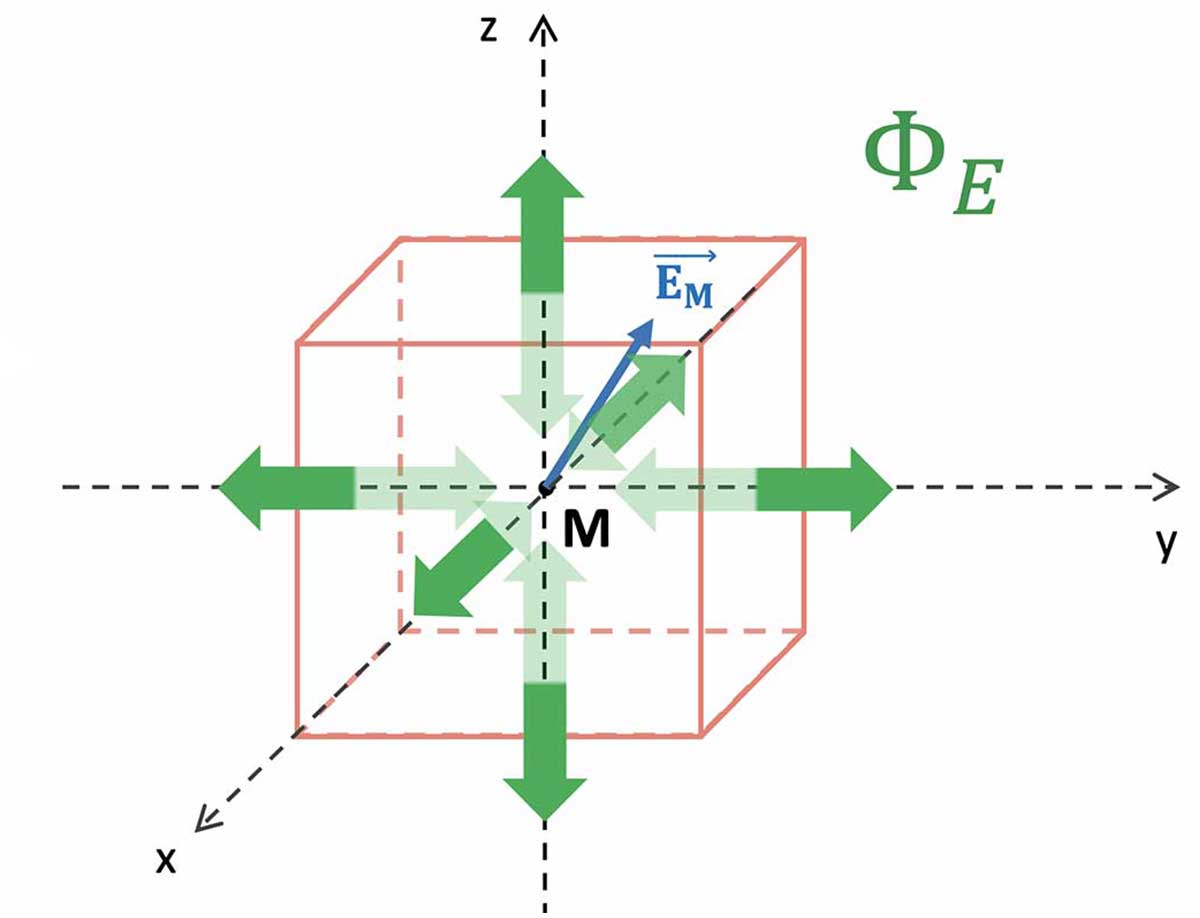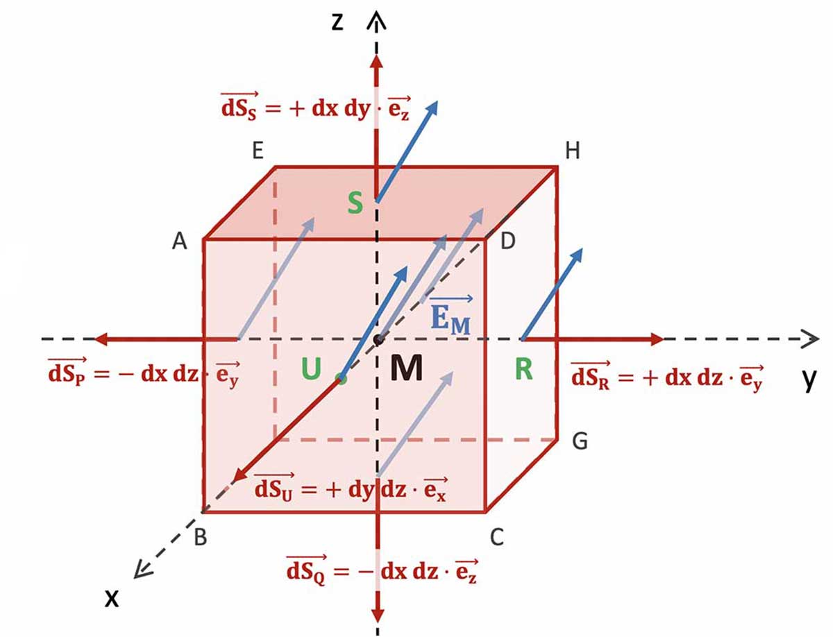 * Le flux total $`\Phi_X`$ à travers les six faces de l'élément de volume donne $`\left(\left.\dfrac{\partial X_x}{\partial x}\right|_M+\left.\dfrac{\partial X_y}{\partial y}\right|_M+\left.\dfrac{\partial X_z}{\partial z}\right|_M\right)\cdot dx\,dy\,dz`$.