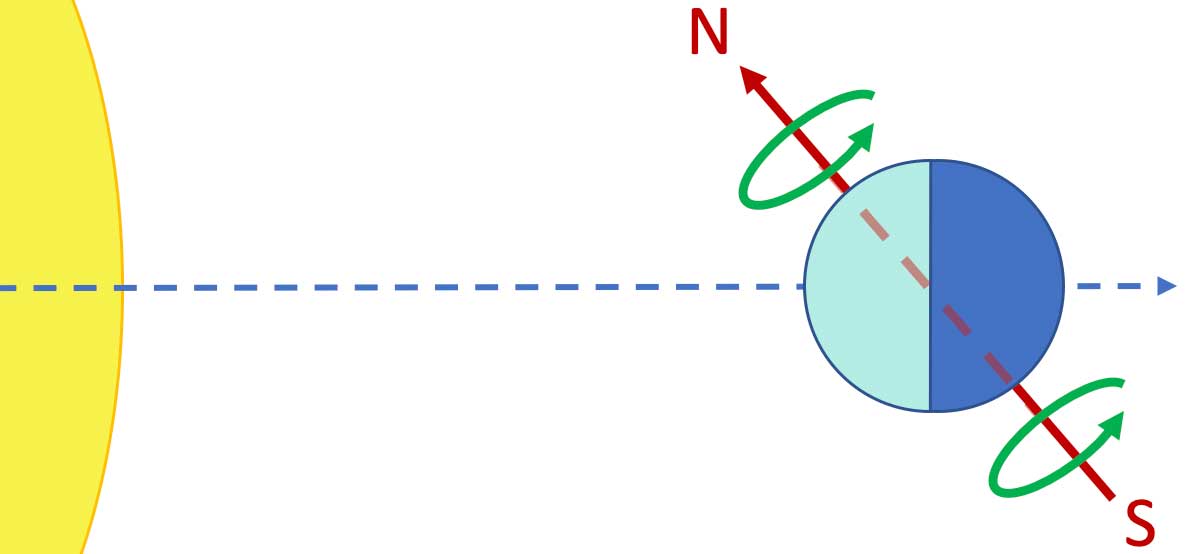 ! * Le 21 juin correspond à la position de la Terre sur son orbite où dans tout l'hémisphère nord, ! la durée du jour est maximale, et elle est minimale d'ans l'hémisphère sud. ! * Le 21 septembre correspond à la position de la Terre sur son orbite où dans tout l'hémisphère sud, ! la durée du jour est maximale, et elle est minimale d'ans l'hémisphère nord. ! * Les 21 mars et 21 septembre, l'axe Sud-Nord est dans le plan perpendiculaire à l'orbite de la Terre. ! En tout lieu de la Terre, le jour et la nuit ont une même durée de 12 heures. !