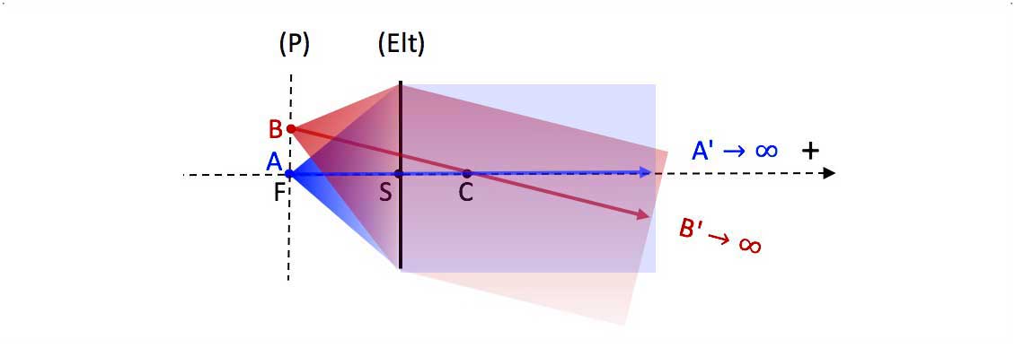 - (P) : object focal plane = first focal plane , contains F : all incident rays originated from a unic point source B leave (Elt) parallel to each other, given an image point B' located at infinity, in direction of the ray passing through C.
