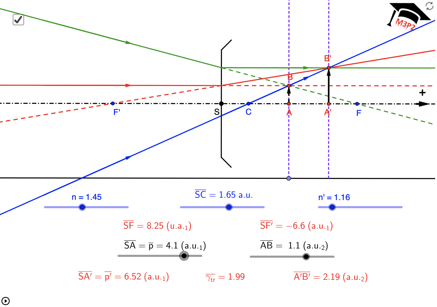 ! * transverse magnification equation : $\dfrac{n_{ini}\cdot\overline{SA_{ima}}}{n_{fin}\cdot\overline{SA_{obj}}}$