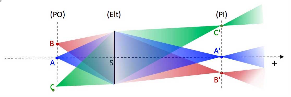 • All object point (A ; B, C, ...) of an object plane (PO) perpendicular to the optical axis have conjugated points images (A' ; B', C', ...) in a same image plane (PI) perpendicular to the optical axis :