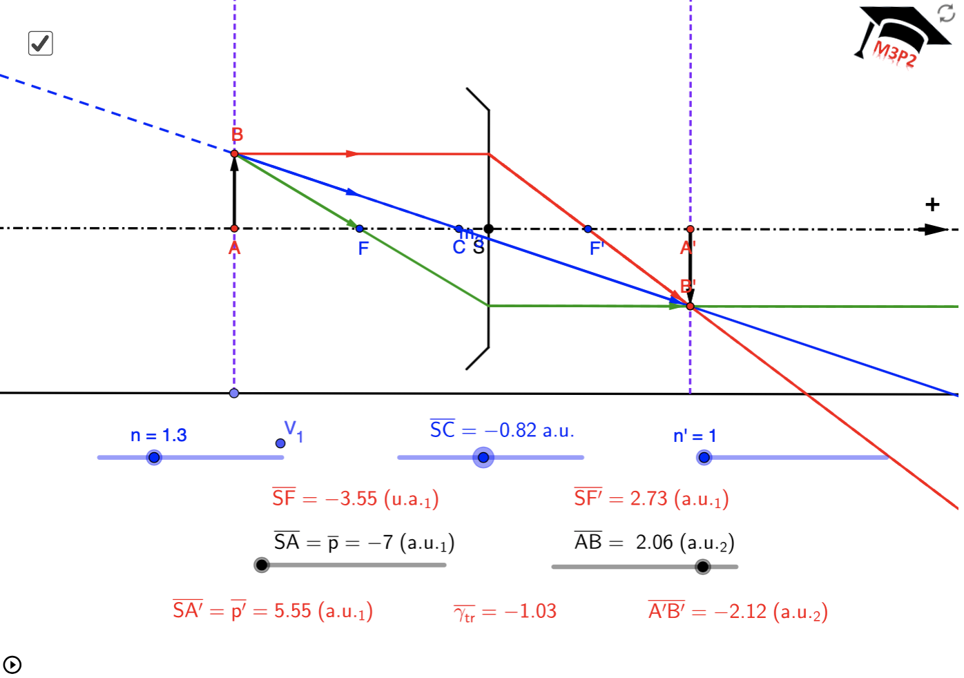 ! * transverse magnification equation : $\dfrac{n_{ini}\cdot\overline{SA_{ima}}}{n_{fin}\cdot\overline{SA_{obj}}}$