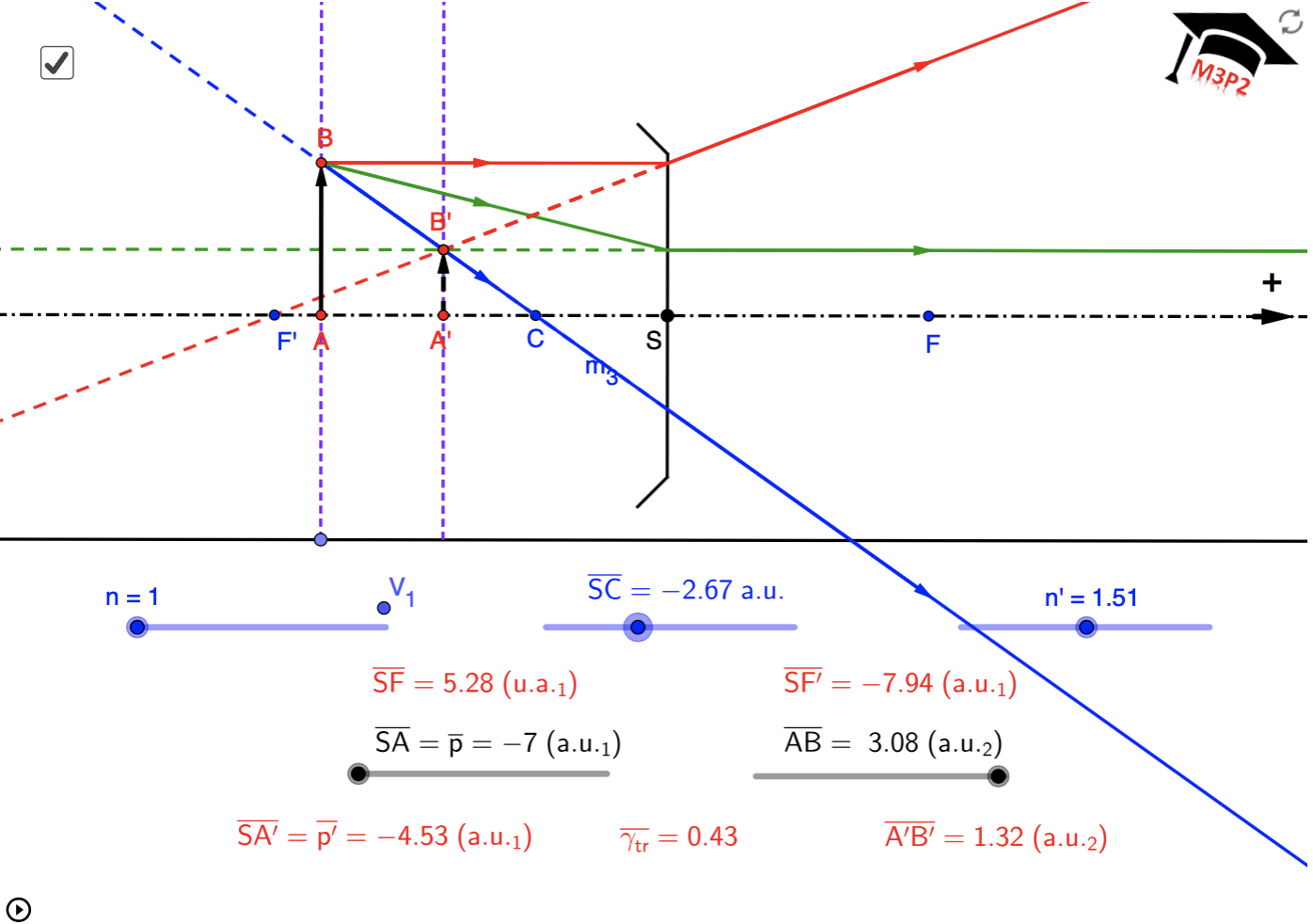 (equ.1)$\Longrightarrow\dfrac{n_{eme}}{\overline{SF'}}=\dfrac{n_{eme}-n_{inc}}{\overline{SC}}$ $\Longrightarrow\overline{SF'}=\dfrac{n_{eme}\cdot\overline{SC}}{n_{eme}-n_{inc}}$ (equ.4) -