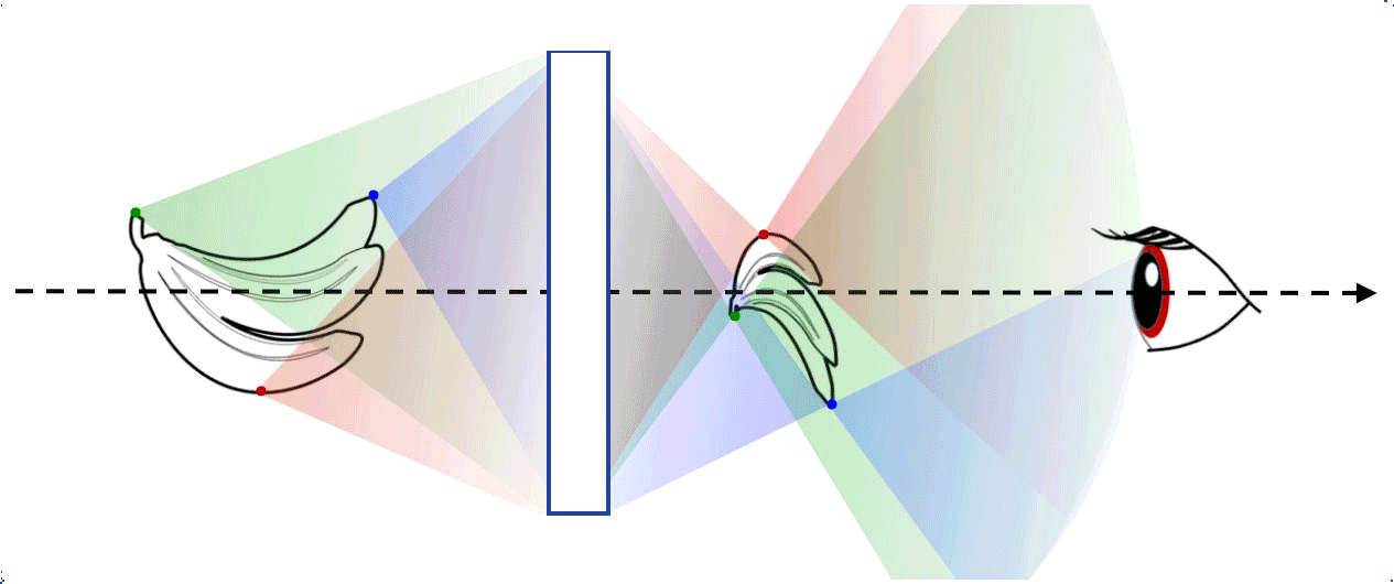 • Object at infinity (P) $\Longleftrightarrow$ object in (P'), can be viewed by naked eye whether convergent or divergent optical element.