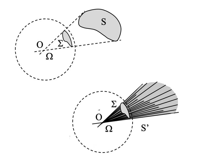 - sous laquelle un observateur voit depuis un point O une surface S dans cet espace.