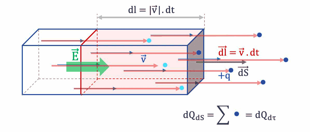 La charge totale $dQ_{dS}$ qui traverse dans le temps $dt$ est donc la charge totale $dQ_{d\tau}$ des porteurs de charge libres contenus dans le volume $d\tau$.