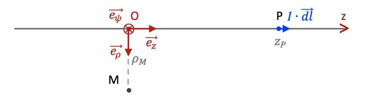 $\overrightarrow{dH}_M\quad=\quad\dfrac{1}{4\pi}\cdot\dfrac{I\cdot\overrightarrow{dl}_P\land\overrightarrow{PM}}{||\,\overrightarrow{PM}\,||^{\,3}}$$\quad=\quad\dfrac{1}{4\pi}\cdot\dfrac{I\cdot dz\,\overrightarrow{e_z}\land d\,\overrightarrow{e_d}}{d^3}$$\quad=\quad\dfrac{I}{4\pi}\cdot\dfrac{dz\;d}{d^3}\cdot \overrightarrow{e_z}\wedge \overrightarrow{e_d}$