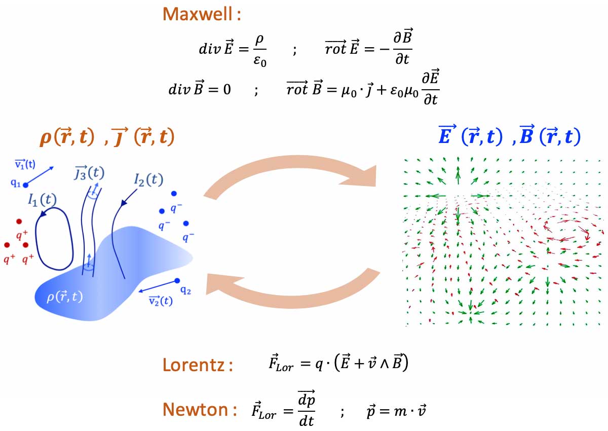 \overrightarrow{F}=\dfrac{\overrightarrow{dp}}{dt}$ avec $\overrightarrow{p}=m\;\overrightarrow{v}$ (les grandeurs étant prises dans la cadre classique de Newton ou celui de la relativité restreinte d'Einstein) appliqués à toute charge, permettent de déterminer l'évolution dans le temps de la distribution de charges et de courants $(\rho, \overrightarrow{j})$, qui permet en retour de calculer l'évolution dans le temps du champ électromagnétique $(\overrightarrow{E},\overrightarrow{B})$.