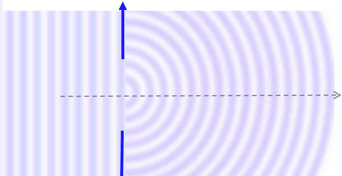 - L'écran est percé d'une simple ouverture infinitésimale, l'onde transmise est alors une onde sphérique centrée sur l'ouverture de même longueur d'onde que celle de l'onde incidente. Il y a continuité de la phase de l'onde à la traversé de l'ouverture infinitésimale.