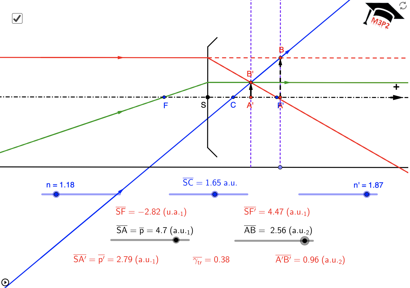 (equ.1)$\Longrightarrow\dfrac{n_{eme}}{\overline{SF'}}=\dfrac{n_{eme}-n_{inc}}{\overline{SC}}$ $\Longrightarrow\overline{SF'}=\dfrac{n_{eme}\cdot\overline{SC}}{n_{eme}-n_{inc}}$   (equ.4)