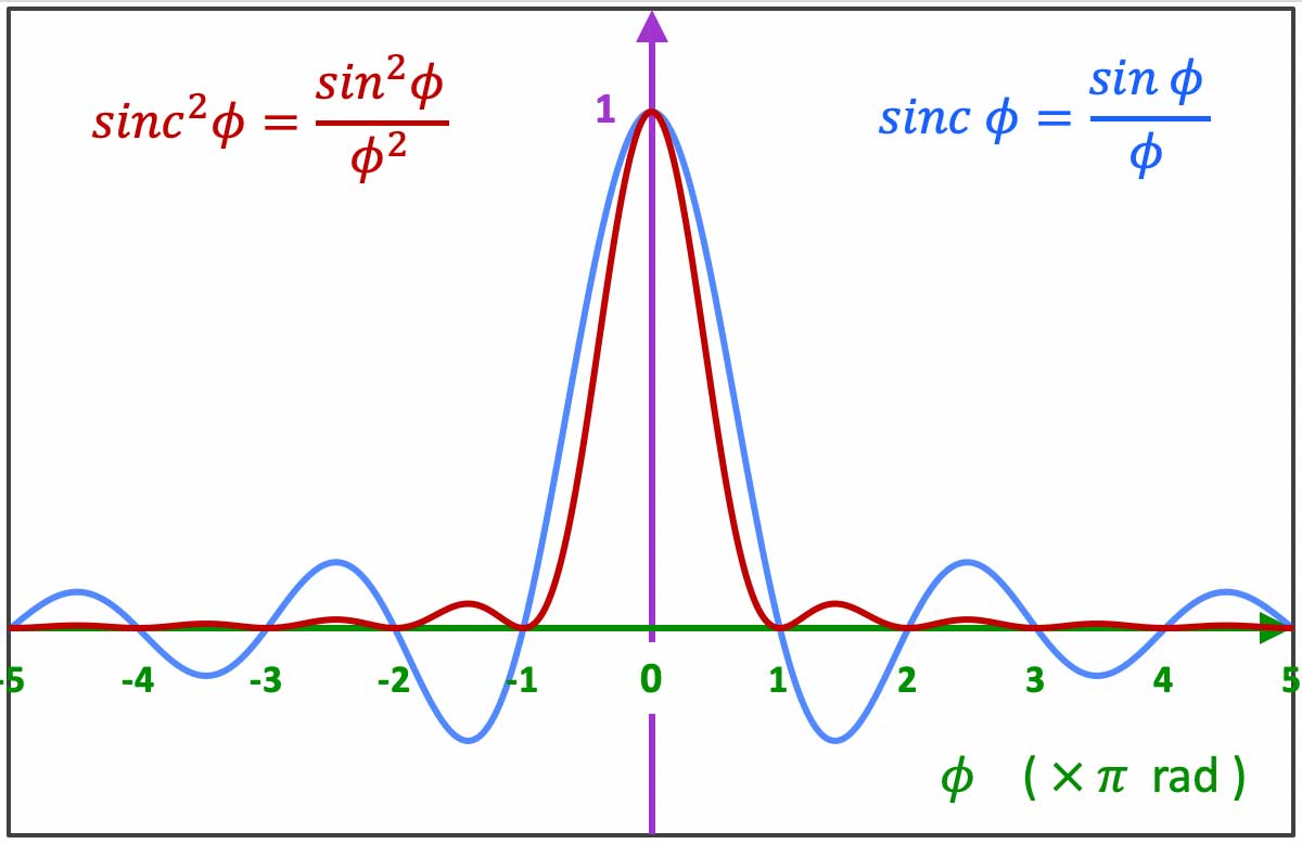 ! La *fonction sinus cardinale $sinc\;\phi = \dfrac{sin\;\phi }{\phi }$ et son carré $sinc^2$ sont deux fonctions fondamentales qui interviennent dans de nombreux phénomènes ondulatoires en physique.