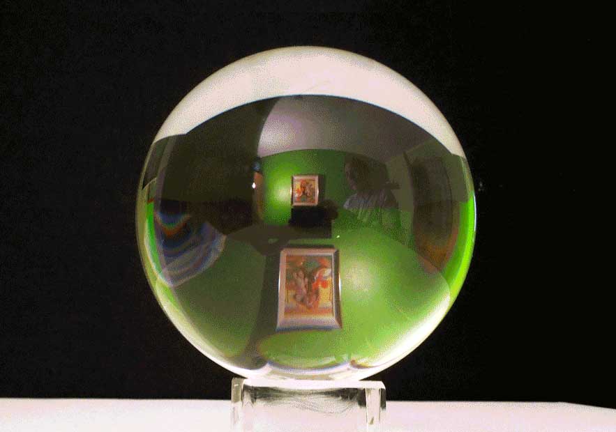 ! * At a refracting interface, part of the light incident power is refracted, and part is reflected. For transparent material like glass and for visible light, the part of the reflected power is small. If the room had been homogeneously illuminated, the images 2 and 3 of the painting on the wall behind the camera would have been faintly visible compared to the image of the front wall through the lensball. !!!!! DIFFICULT POINT (contribute, or indicate a difficult point of understanding) !!!!