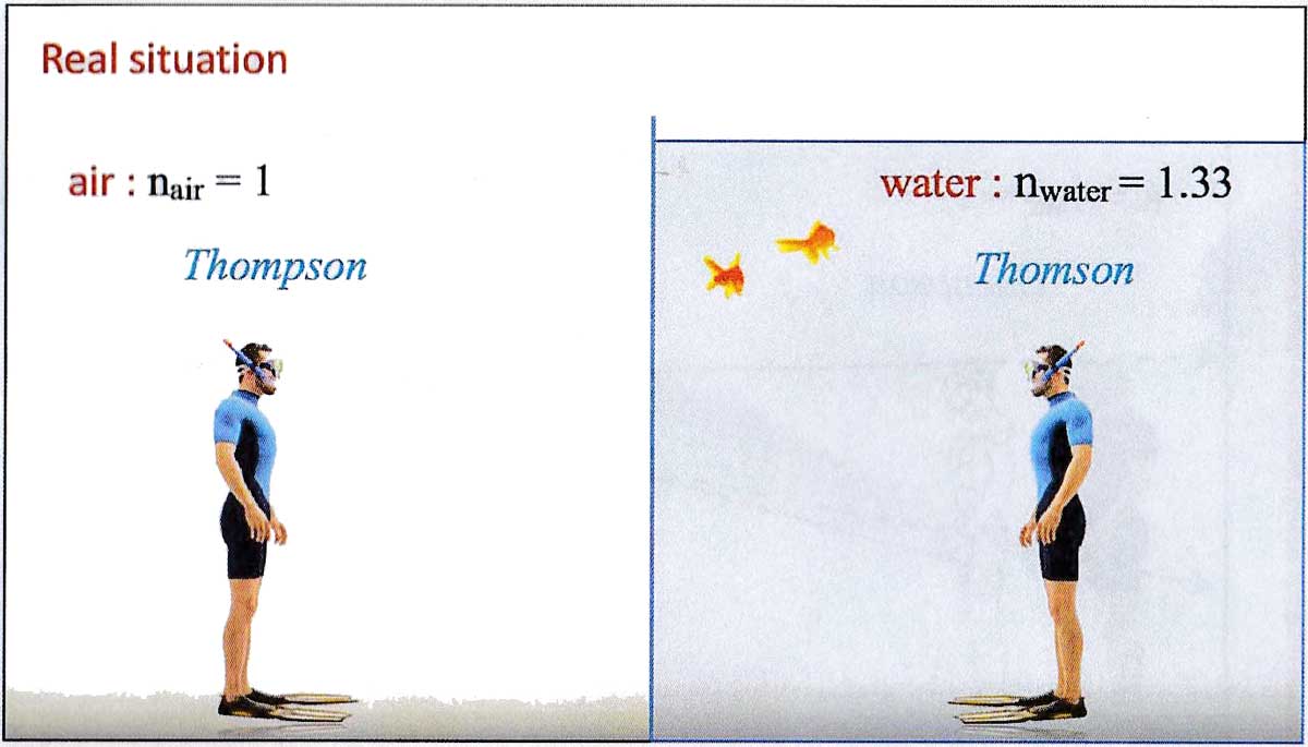!!!! (Strictly speaking, the eye of a fish should be considered in this situation, eyes well adapted to the vision in water, and in direct contact with water. If not, we should consider that the Thompson’s dive mask is filled with water, to have Thomson’s eyes in contact with water and not add another water/air refracting interface (that of the dive mask) on the path of the light). !!!! !!!!
