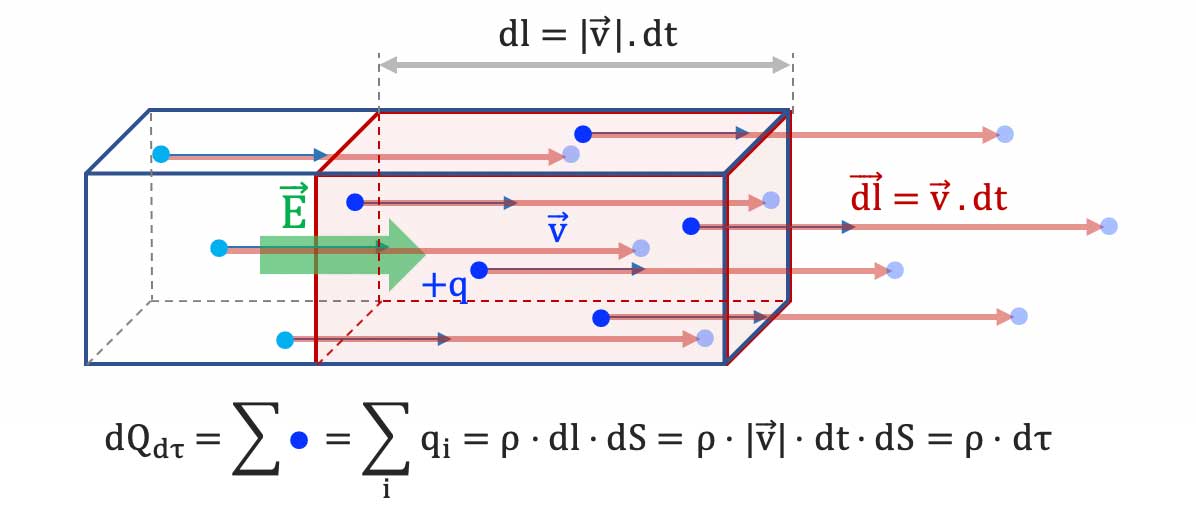 La charge totale $dQ_{dS}$ qui traverse dans le temps $dt$ est donc la charge totale $dQ_{d\tau}$ des porteurs de charge libres contenus dans le volume $d\tau$.