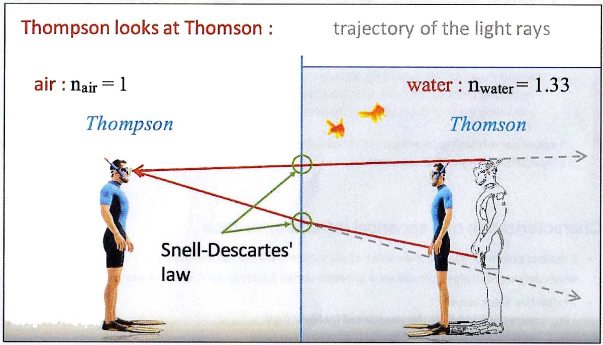 !!!! (Strictly speaking, the eye of a fish should be considered in this situation, eyes well adapted to the vision in water, and in direct contact with water. If not, we should consider that the Thompson’s dive mask is filled with water, to have Thomson’s eyes in contact with water and not add another water/air refracting interface (that of the dive mask) on the path of the light). !!!! !!!!