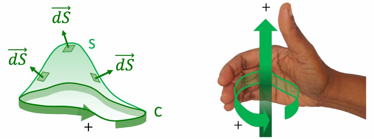 - Choisis une orientation quelconque du contour C, et oriente en conséquence chaque surface élémentaire dS constituant la surface S selon la règle d'orientation de l'espace dite "de la main droite".