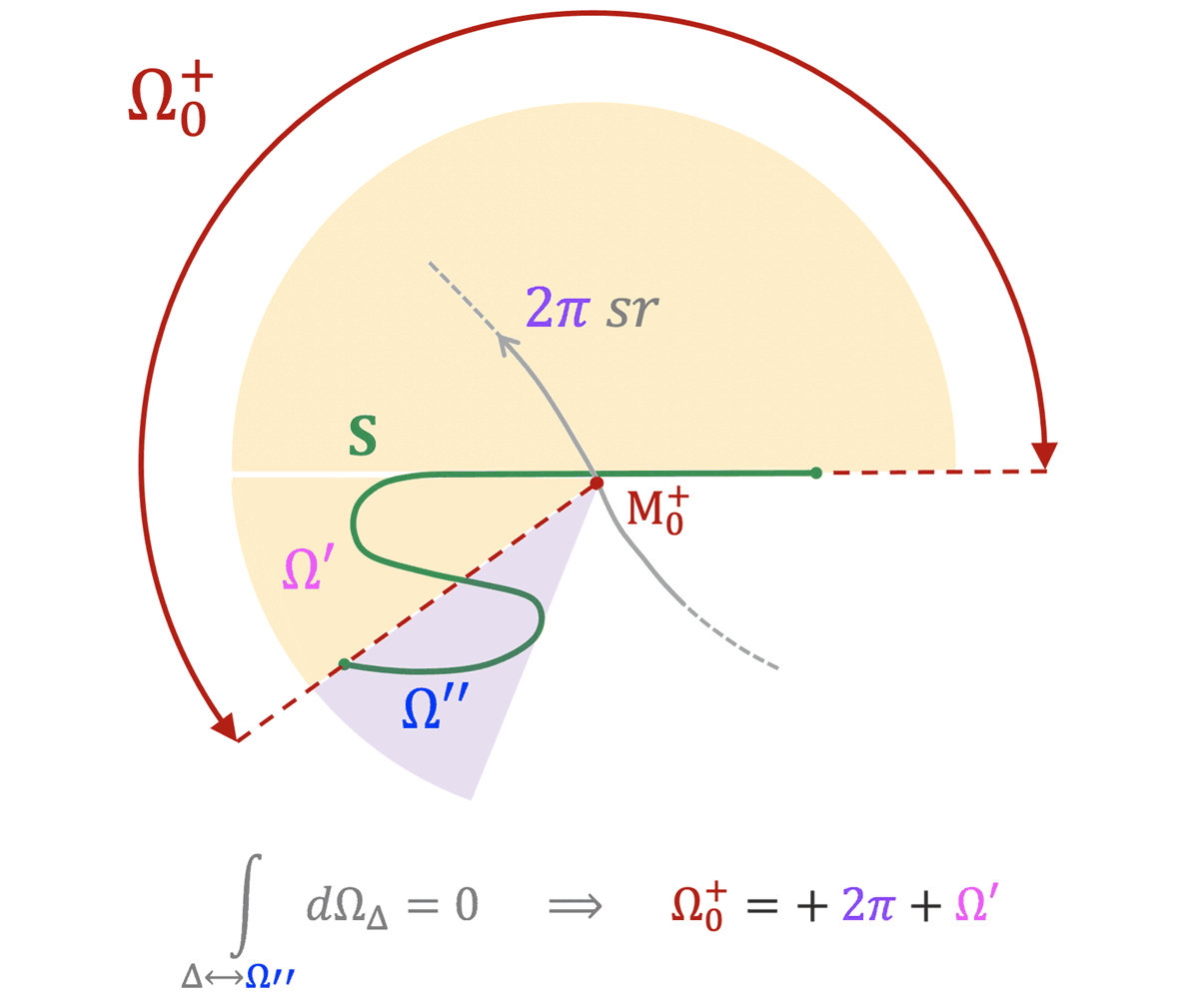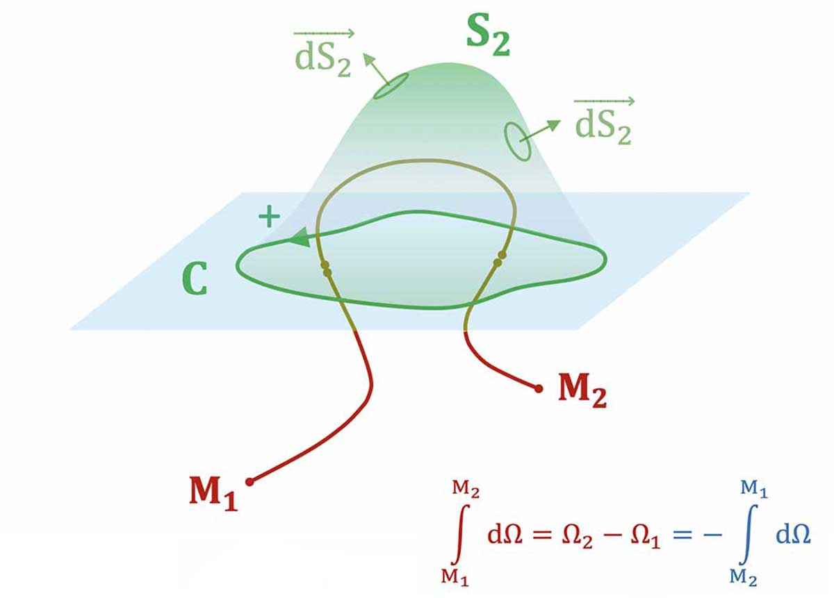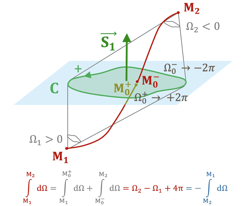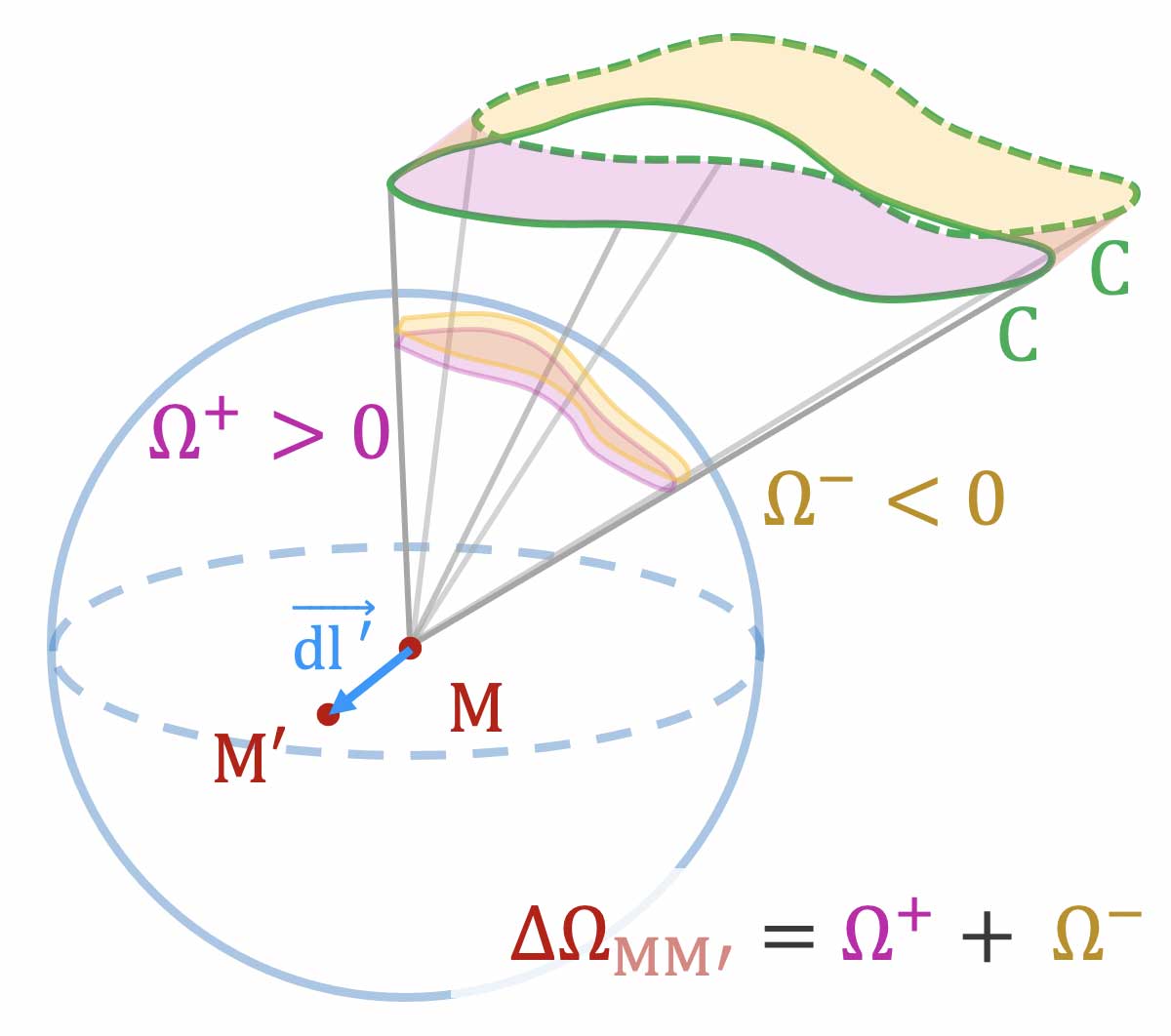 où $\oint_{\mathcal{C}_2} d\Omega$ est la variation de l'angle solide sous lequel est vu le contour $\mathcal{C_2}$ lorsqu'un tout complet est effectué sur le contour $\mathcal{C_1}$.