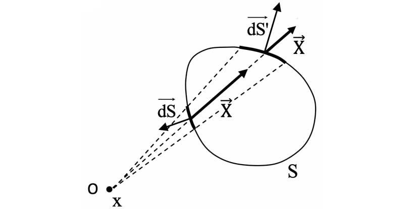 O$ et une surface élémentaire orientée $\overrightarrow{dS}$ de l’espace sont donnés, alors :