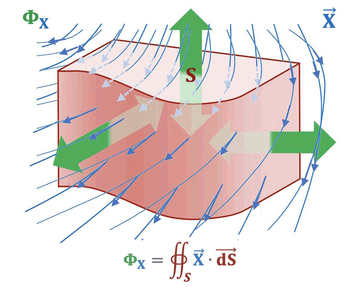 \overrightarrow{X}$ produit un flux élémentaire $d\Phi_X$ à travers chaque $d\tau$ délimité par un élement de surface fermée $dS$.